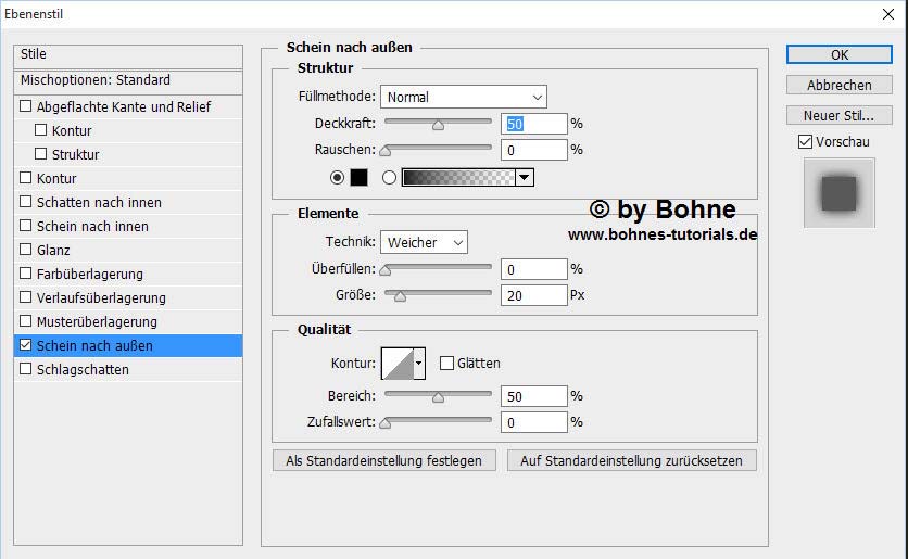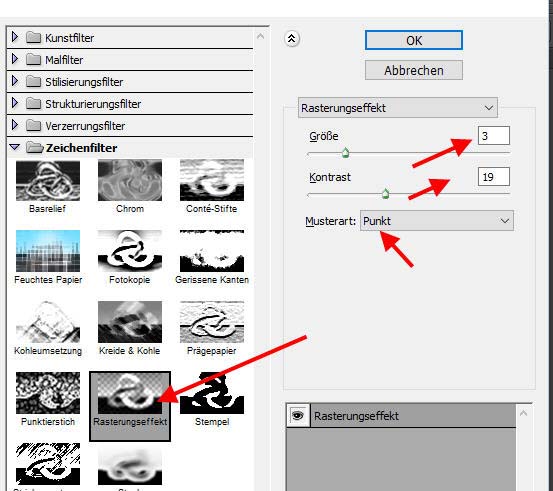 mit Strg+F den Filter wiederholen Benenne diese Ebene "Punkte"  Auswahl -> Auswahl umkehren ( Umschalt+Strg+I) Aktiviere die oberste Ebene Neue Ebene erstellen Fülle die Auswahl mit einer beliebigen Farbe Ebenenstil hinzufügen -> Schein nach außen