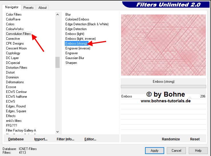 Aktiviere den Rand mit dem Zauberstab Über Umschalt+F5 mit dem neuen Muster füllen   Filter -> I.C.NET Software -> Filter Unlimited 2.0 -> Convolution Filters -> Emboss (strong) Mit Standardeinstellung  Auswahl beibehalten          13) Neue Ebene erstellen  Fülle die Auswahl mit deiner dunklen Farbe  Filter -> Zeichenfilter -> Rasterungseffekt