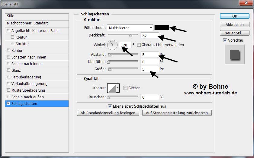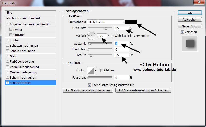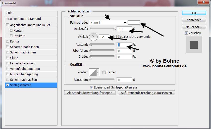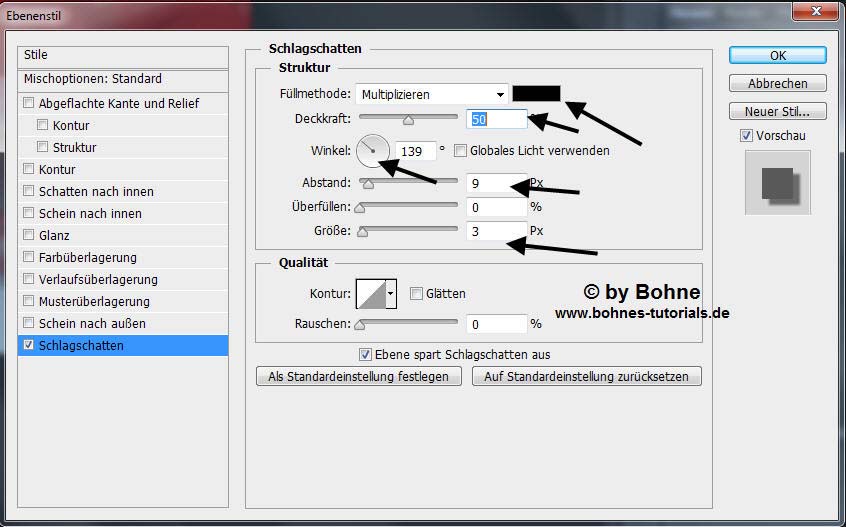 Falls die Schriftzeichen die Schmetterlinge verdeckt, verschiebe diese dann einfach etwas nach rechts.  Wenden bei den Zeichen nun folgenden Schlagschatten an.