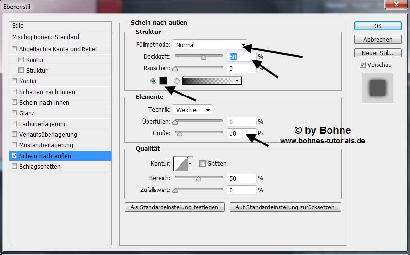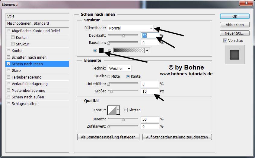 Auswah -> Auswahl umkehren Neue Ebene erstellen und über Umschalt+F5 mir deiner VGF füllen Ebenenstil hinzufügen -> Schein nach innen