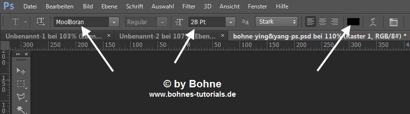 15) Aktiviere das Text-Werkzeug  Such dir die Schrift "MoolBoran"  oder eine Schrift deiner Wahl heraus  Schreibe Yin & Yang,  oder was immer du möchtest Und übernehme folgende Einstellung